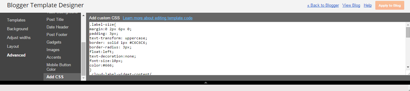 Masukkan kod di bawah di ruangan Add CSS. Anda boleh mengubah  Font style, warna Font, warna yang bertukar apabila pengguna hover mouse atas label dan lain-lain. Klik Apply to Blog setelah selesai